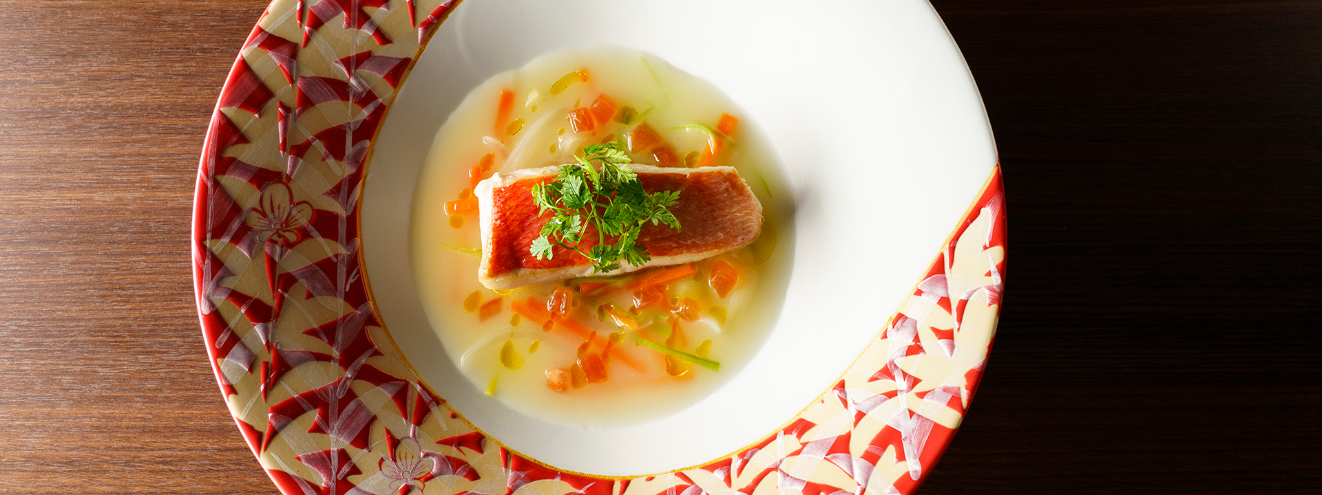 下田東急ホテルのレストラン「マ・シェール・メール 番所」では季節ごとに新しいメニューにて和洋折衷コースディナーをご提供しております。