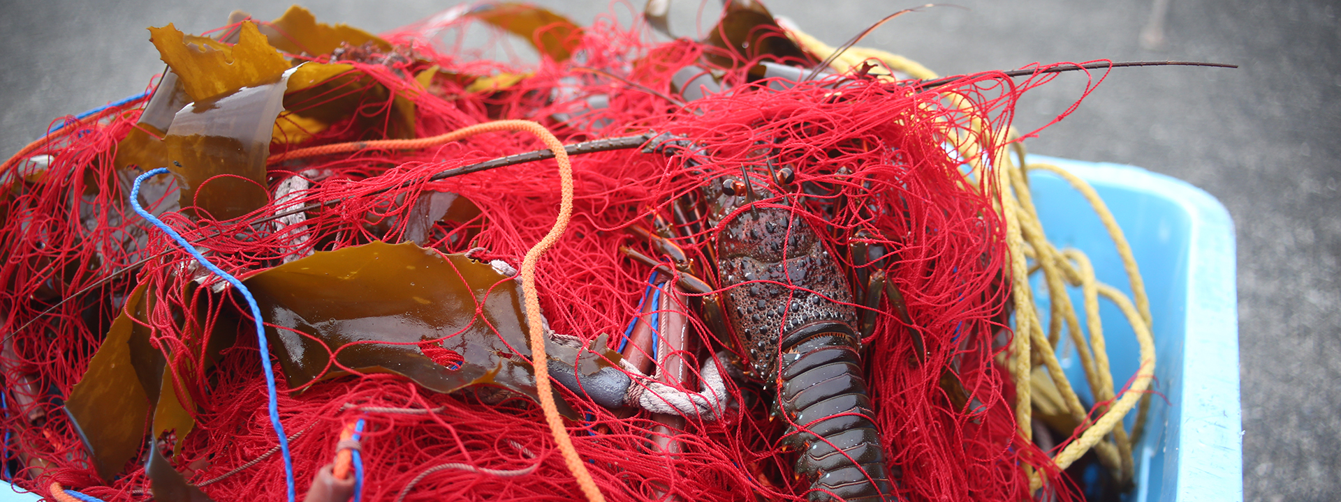 漁師さんたちが網にかかった伊勢海老を丁寧に外します。