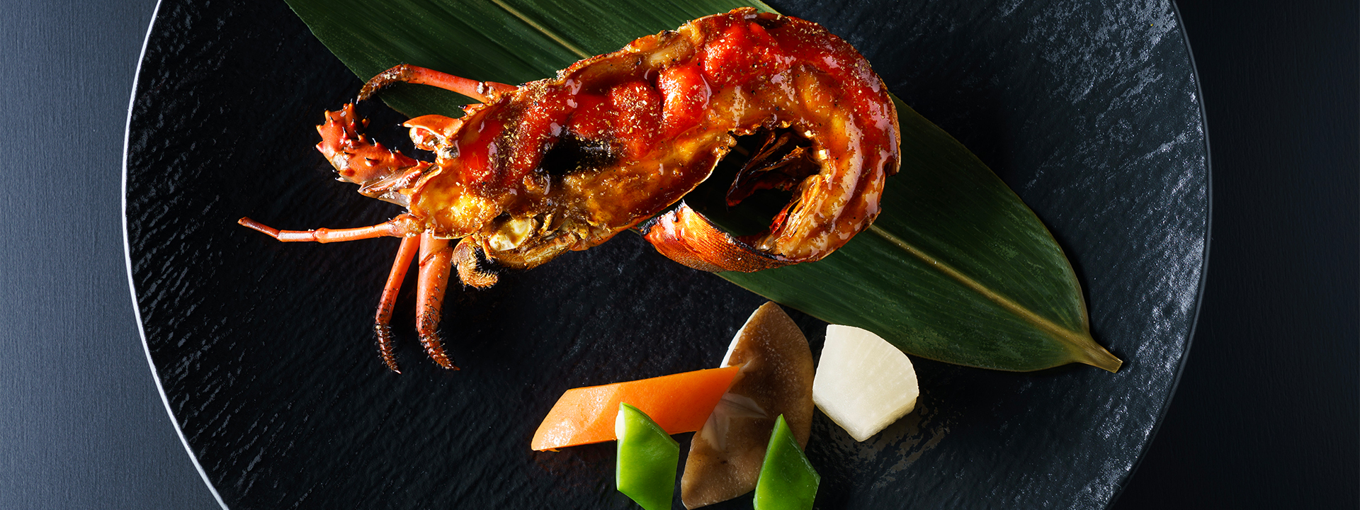1)下田産伊勢海老の鬼瓦焼き 山椒風味 野菜の炊き合わせを添えて