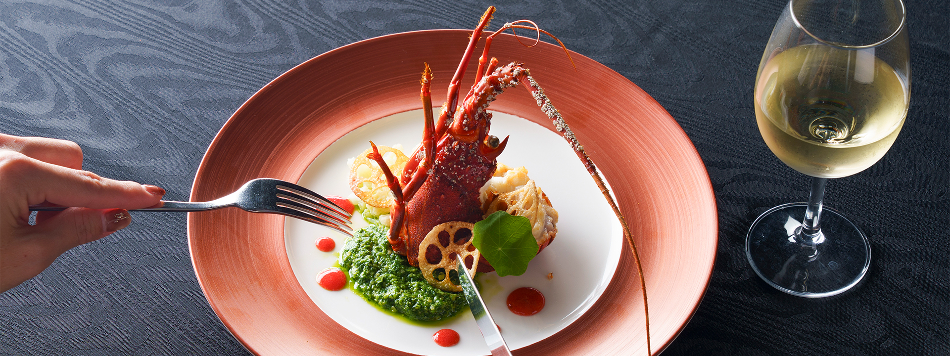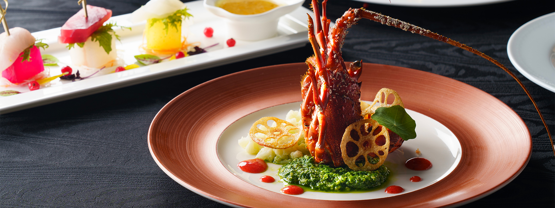 メインの魚料理「伊豆産伊勢海老のロースト」は、伊豆産伊勢海老を伊豆産金目鯛としたものをお選びいただけます。