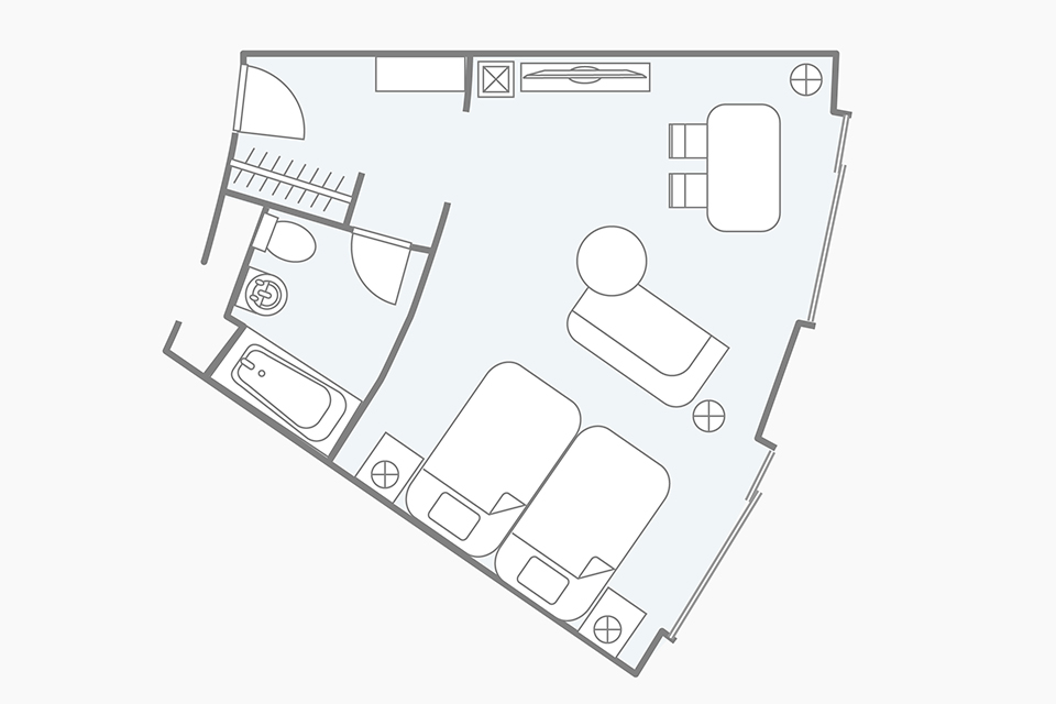 お部屋の間取りはあくまで一例です。面積や家具の配置、備品などはお部屋により異なりますので、あらかじめご了承ください。