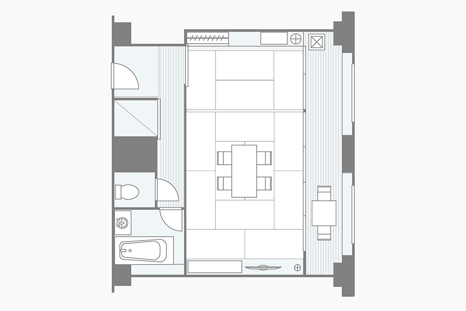 お部屋の間取りはあくまで一例です。面積や家具の配置、備品などはお部屋により異なりますので、あらかじめご了承ください。