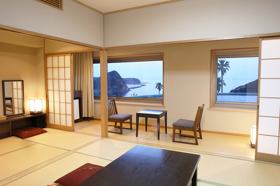 窓の下に階下のレストランの大きな半円の屋根がございます。屋根越しに海を眺めることができます。