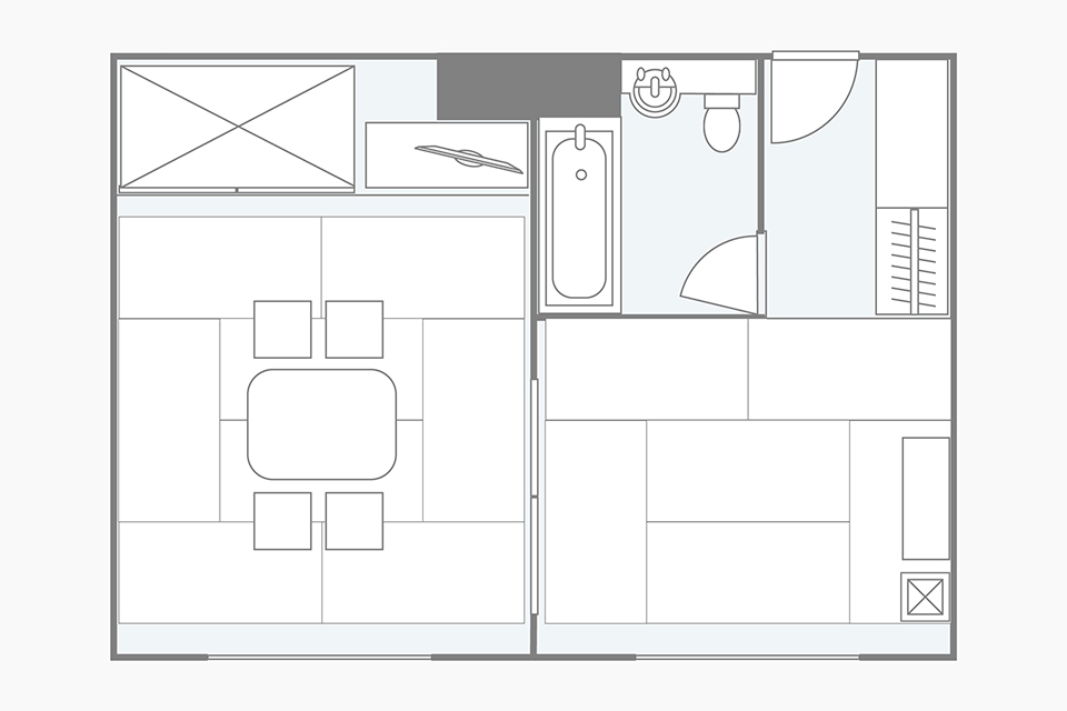お部屋の間取りはあくまで一例です。面積や家具の配置、備品などはお部屋により異なりますので、あらかじめご了承ください。