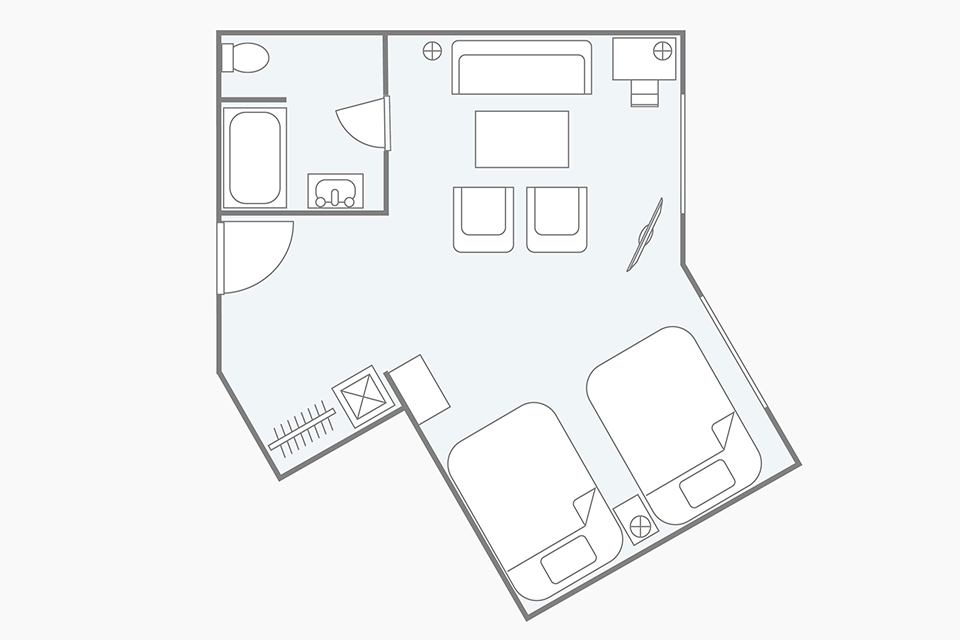 お部屋の間取りはあくまで一例です。面積や家具の配置、備品などはお部屋により異なりますので、あらかじめご了承ください。