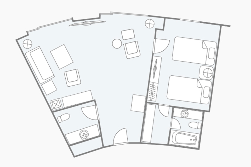 お部屋の間取りはあくまで一例です。面積や家具の配置、備品などはお部屋により異なりますので、あらかじめご了承ください。