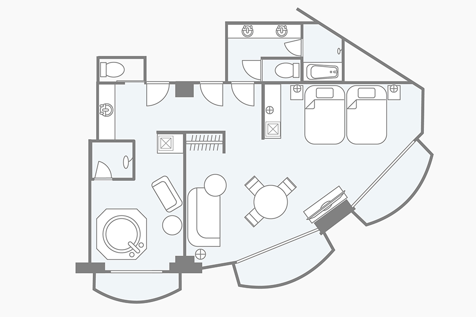 お部屋の間取りはあくまで一例です。面積や家具の配置、備品などはお部屋により異なりますので、あらかじめご了承ください。