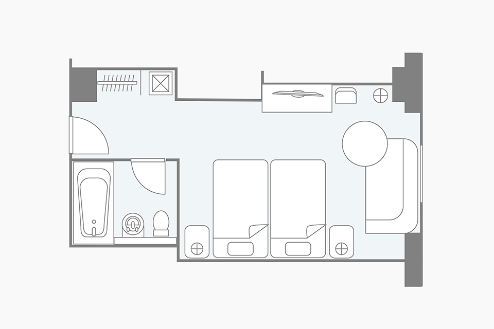 お部屋の間取りはあくまで一例です。面積や家具の配置、備品などはお部屋により異なりますので、あらかじめご了承ください。