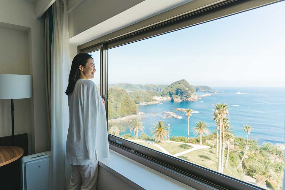 海抜56mの高台に建ち、晴れた日には伊豆七島までも一望できる「美しい景観」と、新鮮な山海の幸や温泉や四季の花などの「豊かな自然の恵み」が魅力。目の前に広がるナティエブルーの海、椰子の葉が潮風にそよぐガーデンが広がります。