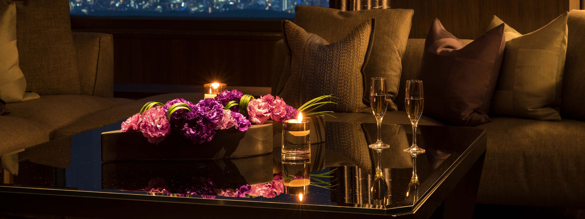 ご夕食は、お部屋でお楽しみいただくインルームダイニングでご用意。みなとみらいの夜景を眺めながらの、おふたりだけのプライベートダイニングです。