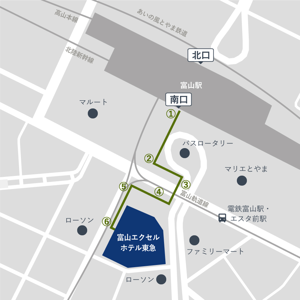 富山駅を背に「CIC」というビルが見えて参りますので、その方面へ横断歩道をお進みください。横断歩道を渡る際は、路面電車の線路がございますのでご注意ください。