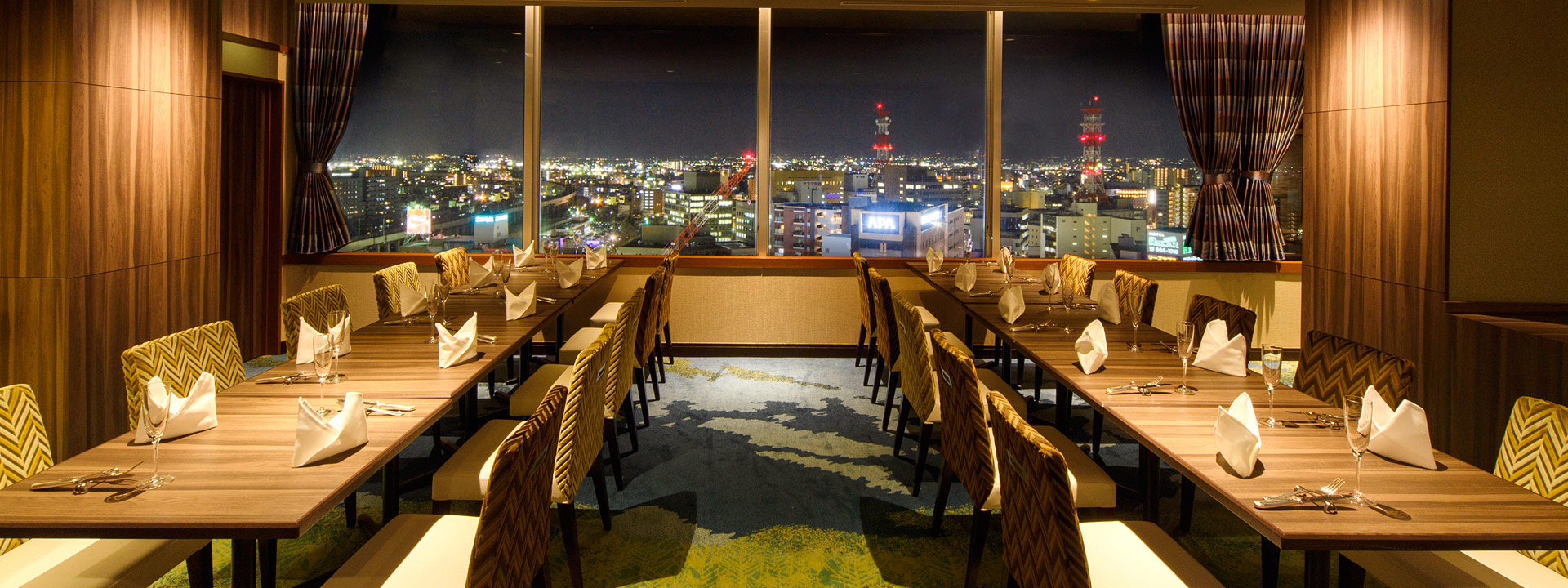 その名が差す通り、空気が澄んだ日の朝・昼は3,000m級の立山連峰が、夜には富山市内の夜景という最高の眺望を楽しみながら、洗練された味覚をご堪能いただけます。