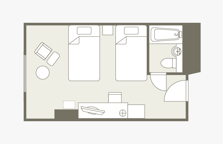 お部屋の間取りはあくまで一例です。面積や家具の配置、備品などはお部屋により異なりますので、あらかじめご了承ください。