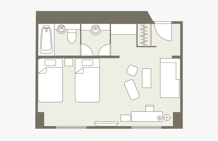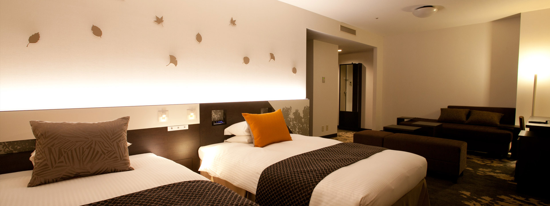お部屋の間取りはあくまで一例です。面積や家具の配置、備品などはお部屋により異なりますので、あらかじめご了承ください。