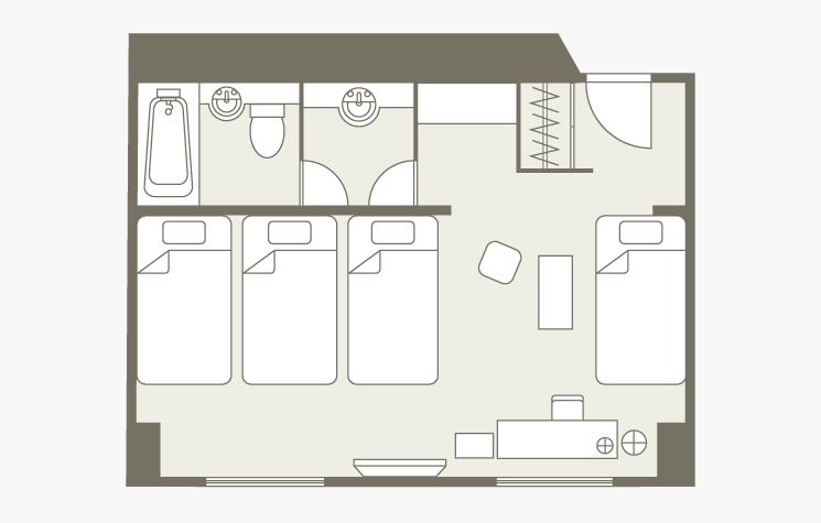 お部屋の間取りはあくまで一例です。面積や家具の配置、備品などはお部屋により異なりますので、あらかじめご了承ください。