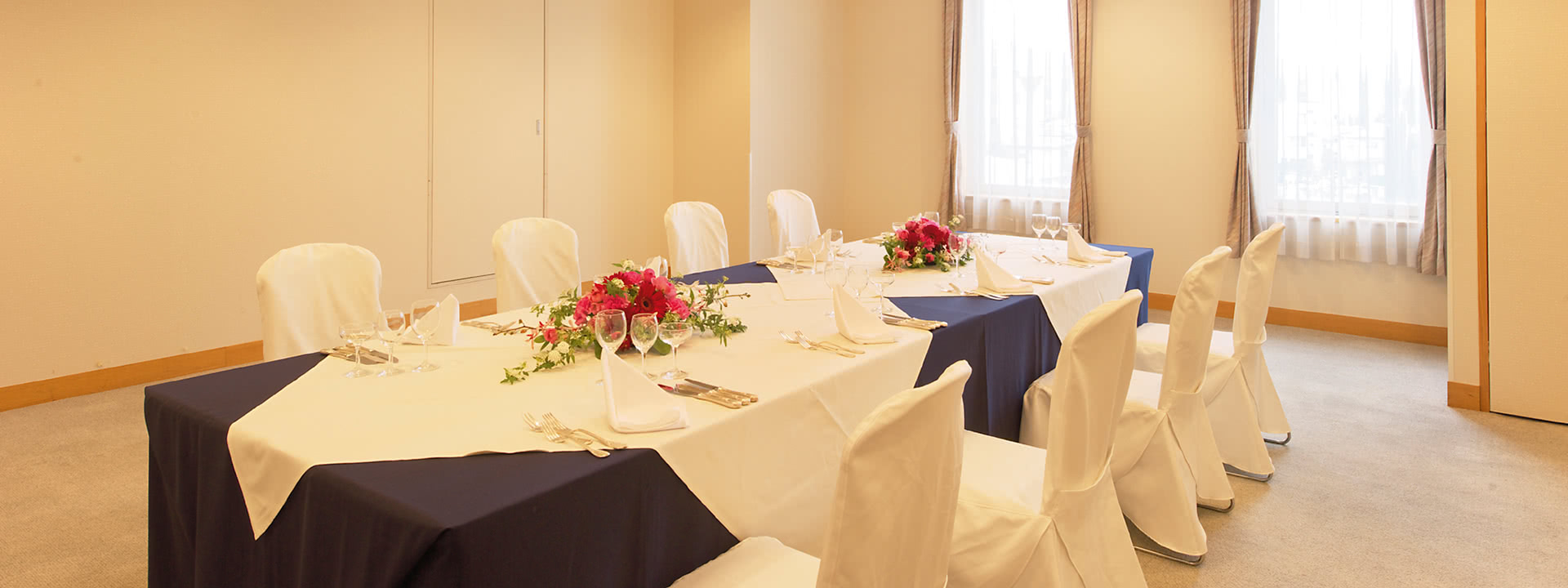 重厚な雰囲気を醸しだすホワイエから、ひとつ奥まった場所に位置する「すずらん」は、コンパクトで上品なバンケットルームです。各種セミナーや各種団体の幹事会、レセプションやセミナーでの分科会会場として、「こまくさ」とともにご利用いただくこともできます。同じ階にあるメインバンケット「信濃」のレセプション事務局としても最適です。