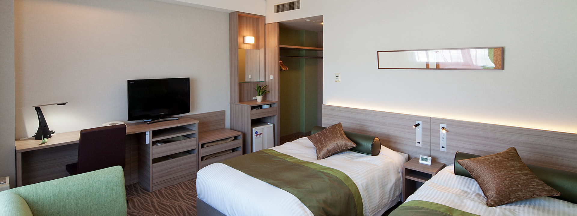 シンプルで明るく機能的なお部屋は、ビジネスユースにも対応。温かみのある色調の客室で、ごゆっくりお寛ぎください。