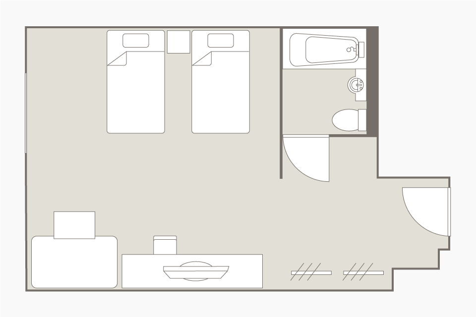 お部屋の間取りはあくまで一例です。面積や家具の配置、備品などはお部屋により異なりますので、あらかじめご了承ください。