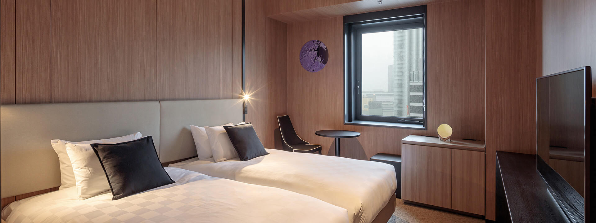パブリックスペースとのギャップが、違う空間へとワープしてきたことを強く感じさせるナチュラルな客室。